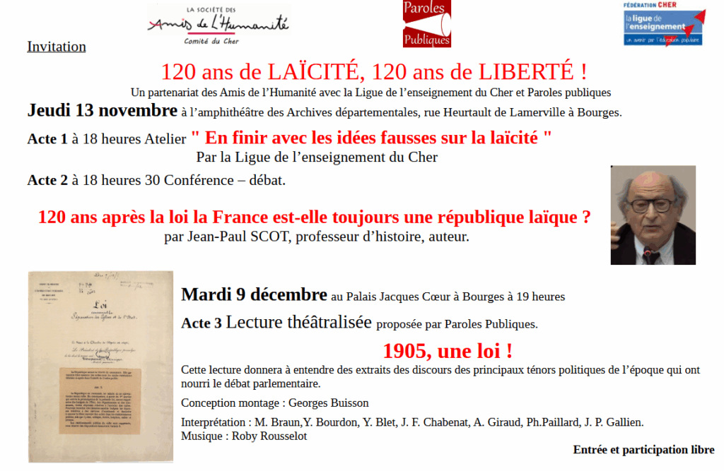 BOURGES : Conférence la 13 Novembre et Lecture théâtralisée le 9 décembre 2025 Posted on 11 novembre 202514 novembre 2025 Posted in Amis de l'Huma, Conférences-Expositions, Non classé and tagged laïcité, liberté.