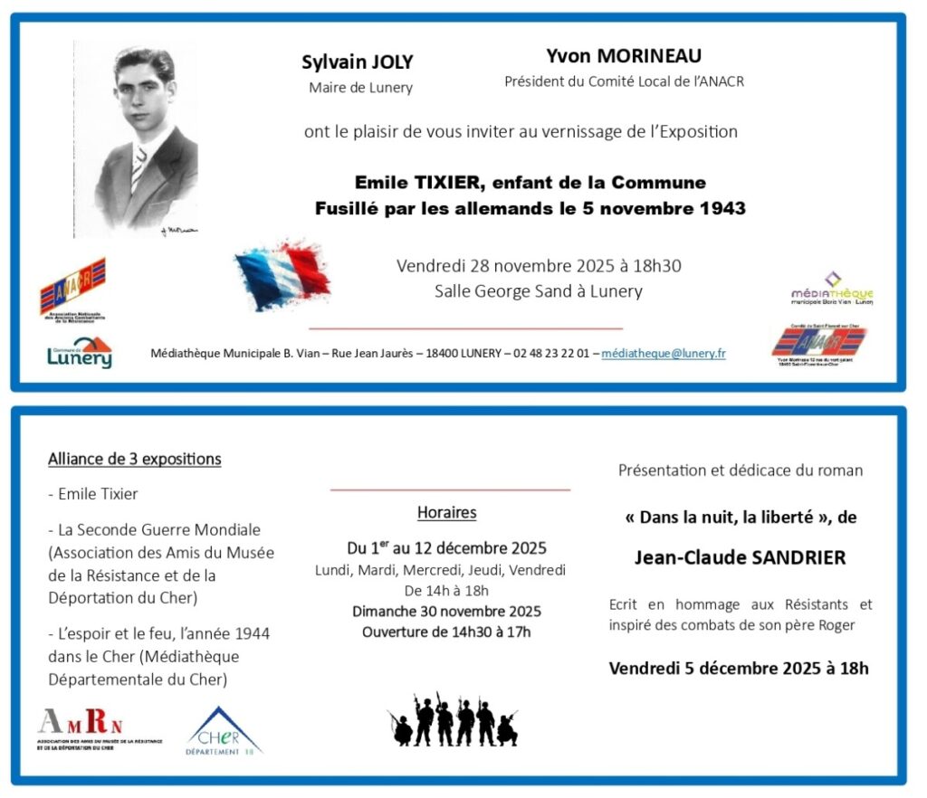LUNERY – Exposition (Du 1 au 12 décembre) : Emile TIXIER enfant de la commune fusillé ! Posted on 14 novembre 202528 novembre 2025 Posted in Commémoration, Conférences-Expositions.